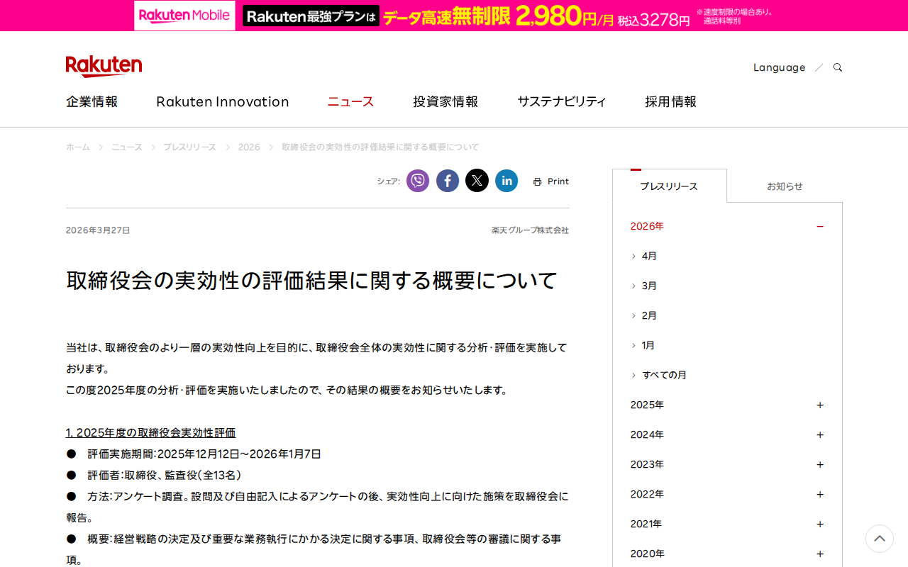 取締役会の実効性の評価結果に関する概要について | 楽天グループ株式会社
