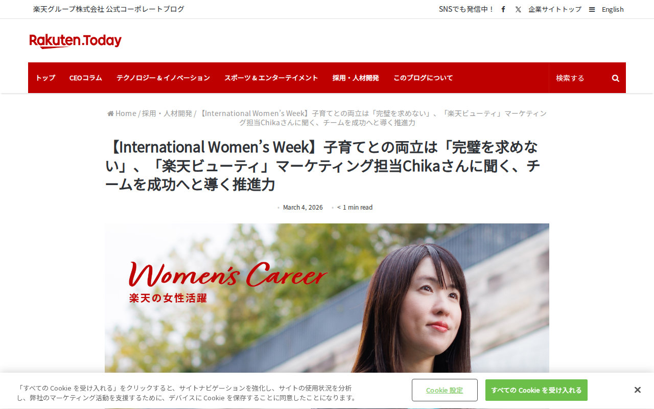 【International Women’s Week】子育てとの両立は「完璧を求めない」、「楽天ビューティ」マーケティング担当Chikaさんに聞く、チームを成功へと導く推進力 - 保存されたスクリーンショット