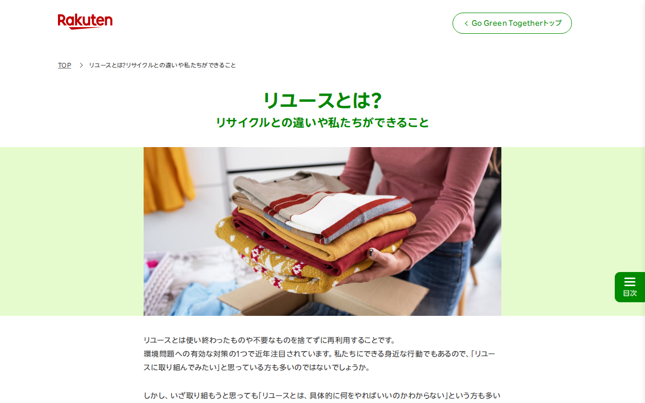 リユースとは?リサイクルとの違いや私たちができること | Go Green Together 楽天グループ株式会社 - 保存されたスクリーンショット