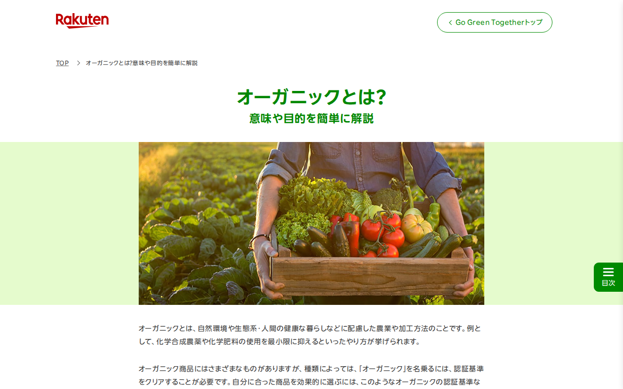 オーガニックとは?意味や目的を簡単に解説 | Go Green Together 楽天グループ株式会社 - 保存されたスクリーンショット