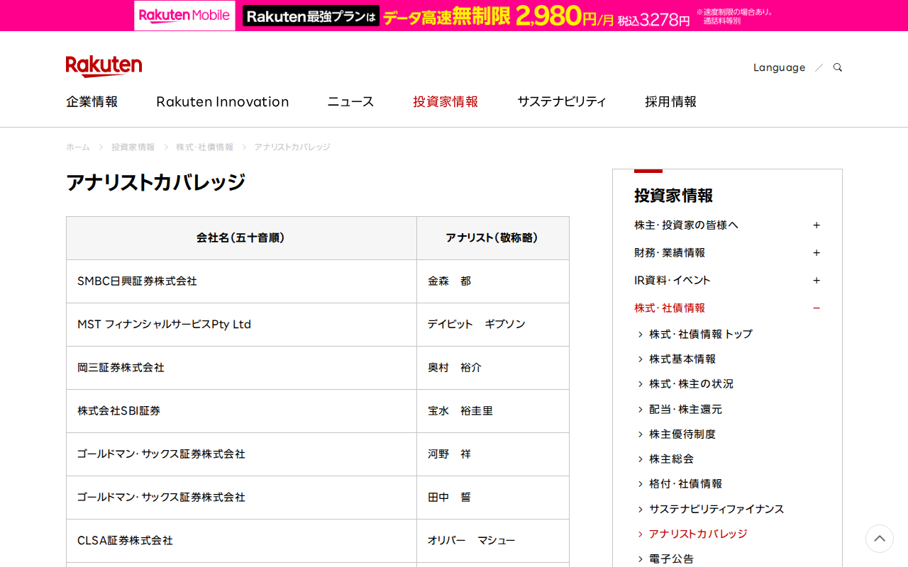 アナリストカバレッジ|楽天グループ株式会社