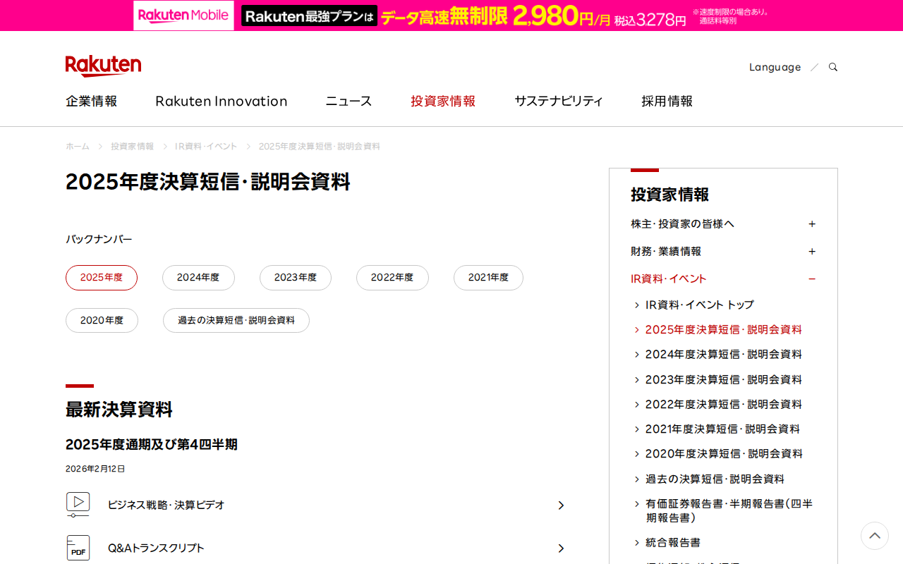2025年度決算短信・説明会資料|楽天グループ株式会社