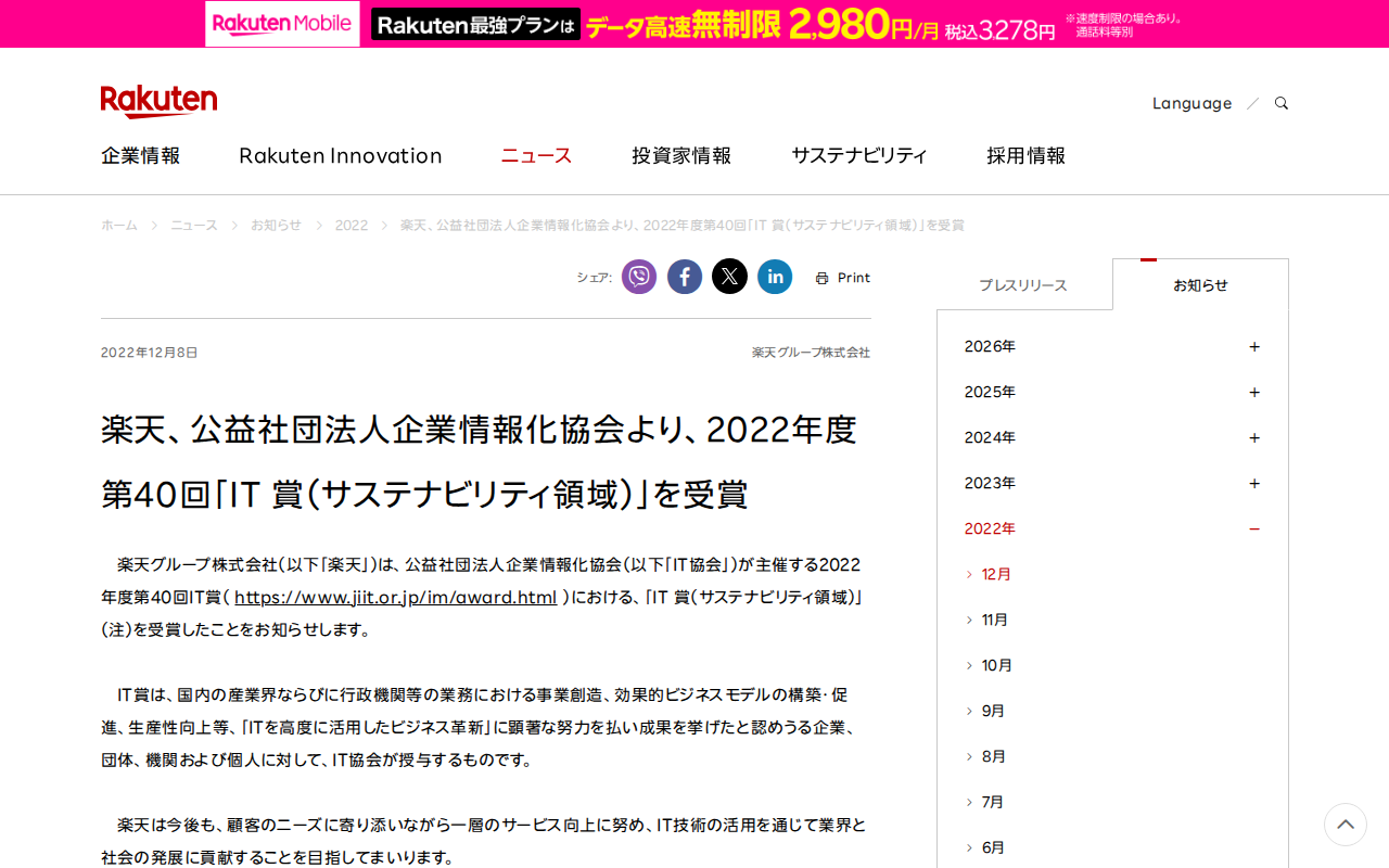 楽天、公益社団法人企業情報化協会より、2022年度第40回「IT 賞(サステナビリティ領域)」を受賞 | 楽天グループ株式会社