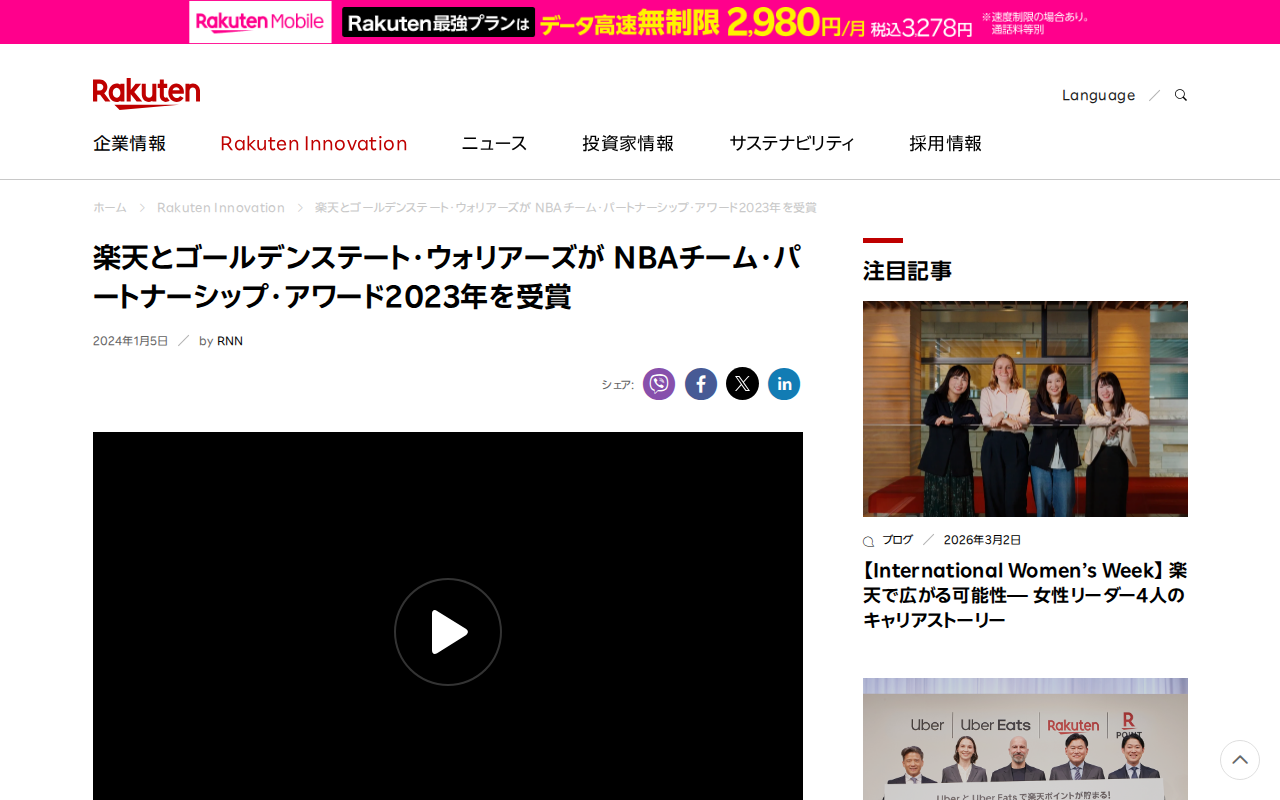 楽天とゴールデンステート・ウォリアーズが NBAチーム・パートナーシップ・アワード2023年を受賞 | 楽天グループ株式会社