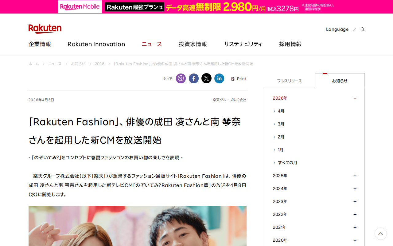 「Rakuten Fashion」、俳優の成田 凌さんと南 琴奈さんを起用した新CMを放送開始 | 楽天グループ株式会社