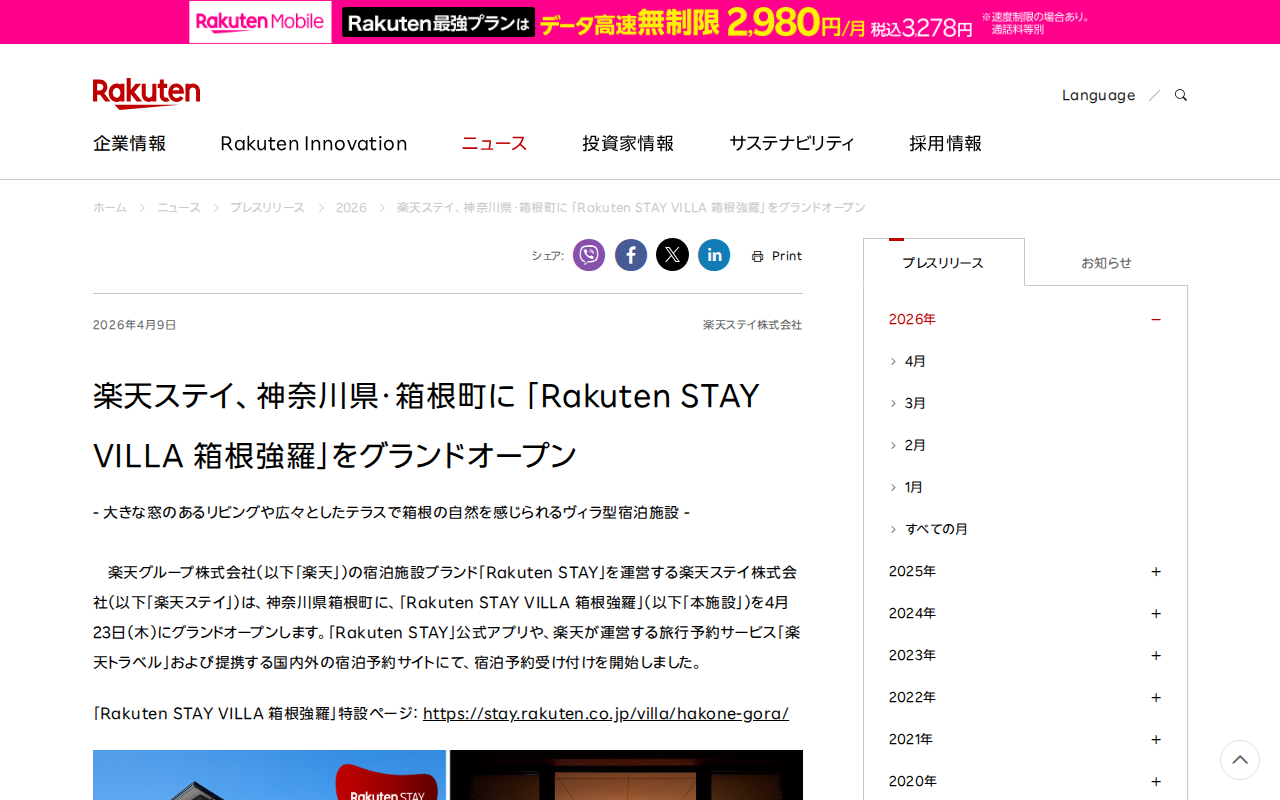 楽天ステイ、神奈川県・箱根町に 「Rakuten STAY VILLA 箱根強羅」をグランドオープン | 楽天グループ株式会社