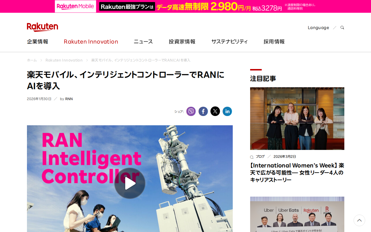 楽天モバイル、インテリジェントコントローラーでRANにAIを導入 | 楽天グループ株式会社
