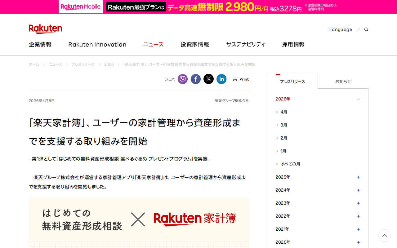 「楽天家計簿」、ユーザーの家計管理から資産形成までを支援する取り組みを開始 | 楽天グループ株式会社