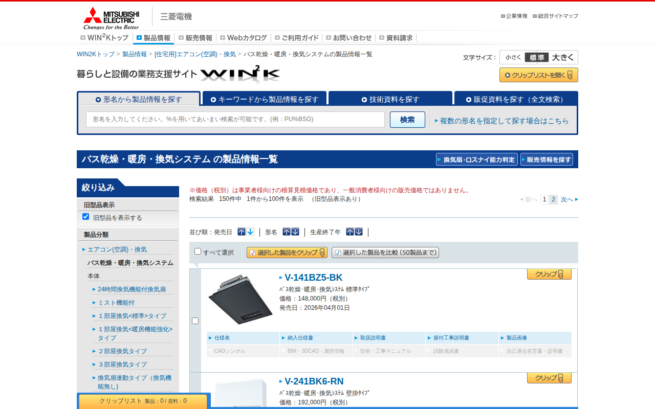 バス乾燥・暖房・換気システムの製品情報一覧|三菱電機WIN2K