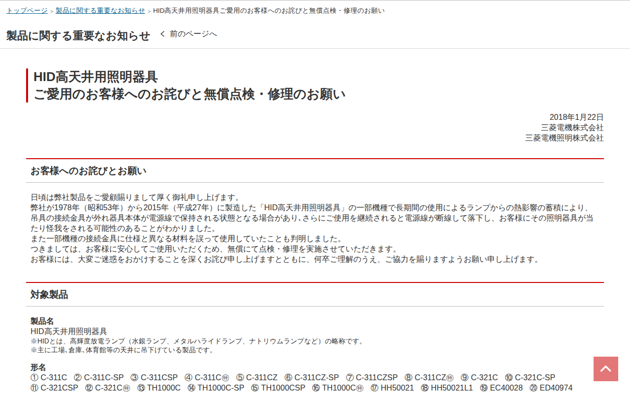 HID高天井用照明器具ご愛用のお客様へのお詫びと無償点検・修理のお願い | 三菱電機