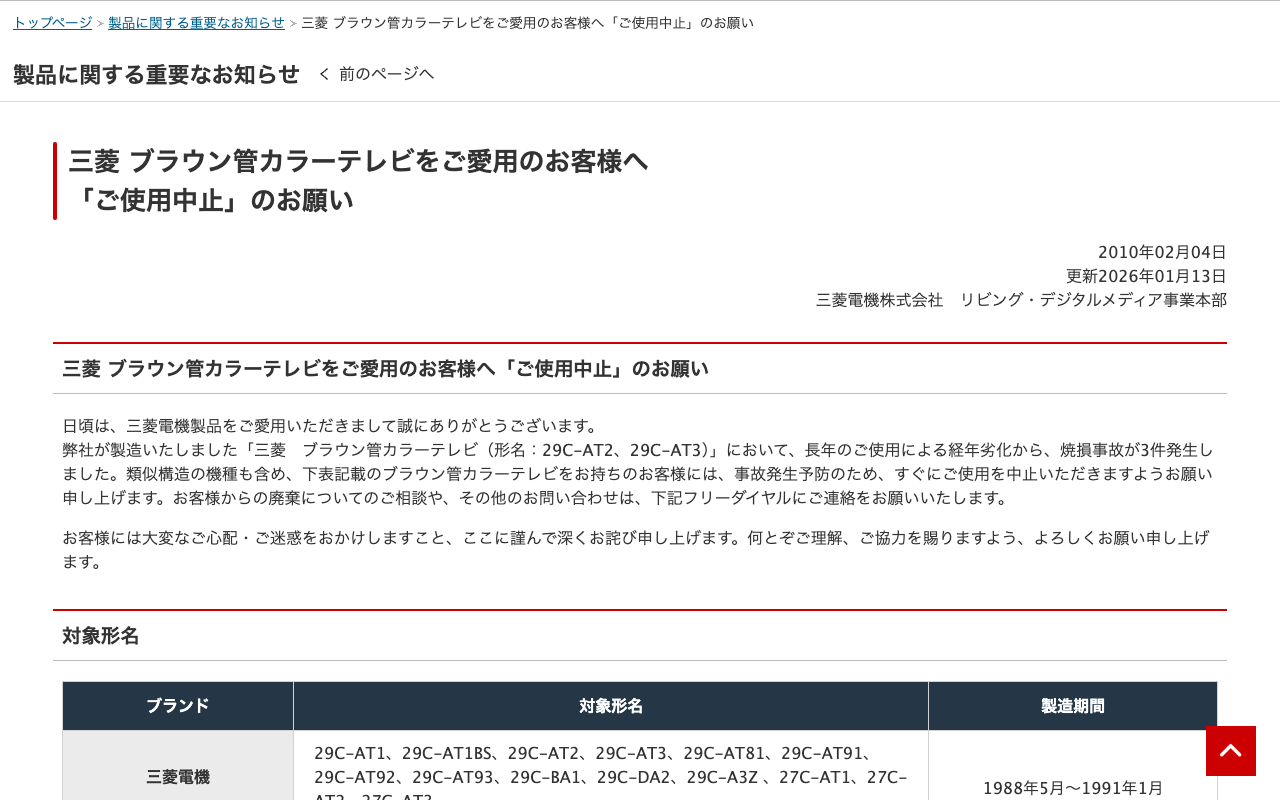 三菱 ブラウン管カラーテレビをご愛用のお客様へ「ご使用中止」のお願い | 三菱電機