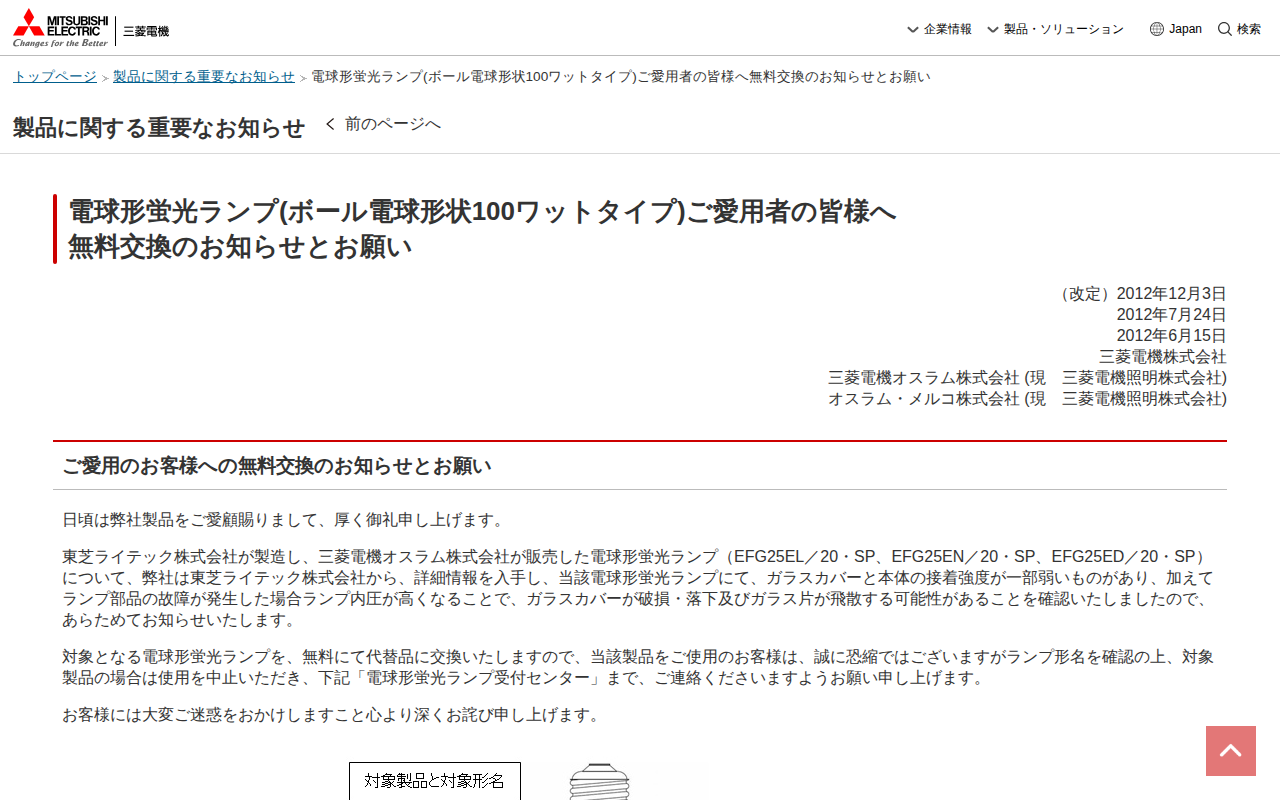 電球形蛍光ランプ(ボール電球形状100ワットタイプ)ご愛用者の皆様へ無料交換のお知らせとお願い | 三菱電機