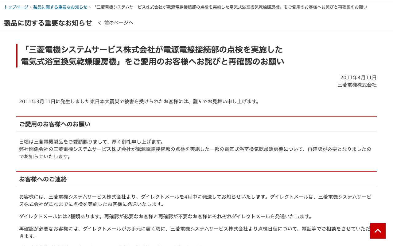 「三菱電機システムサービス株式会社が電源電線接続部の点検を実施した電気式浴室換気乾燥暖房機」をご愛用のお客様へお詫びと再確認のお願い | 三菱電機