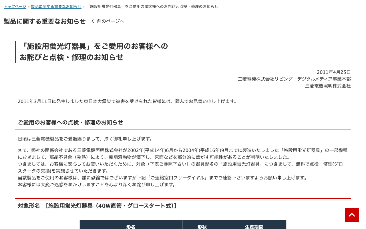 「施設用蛍光灯器具」をご愛用のお客様へのお詫びと点検・修理のお知らせ | 三菱電機