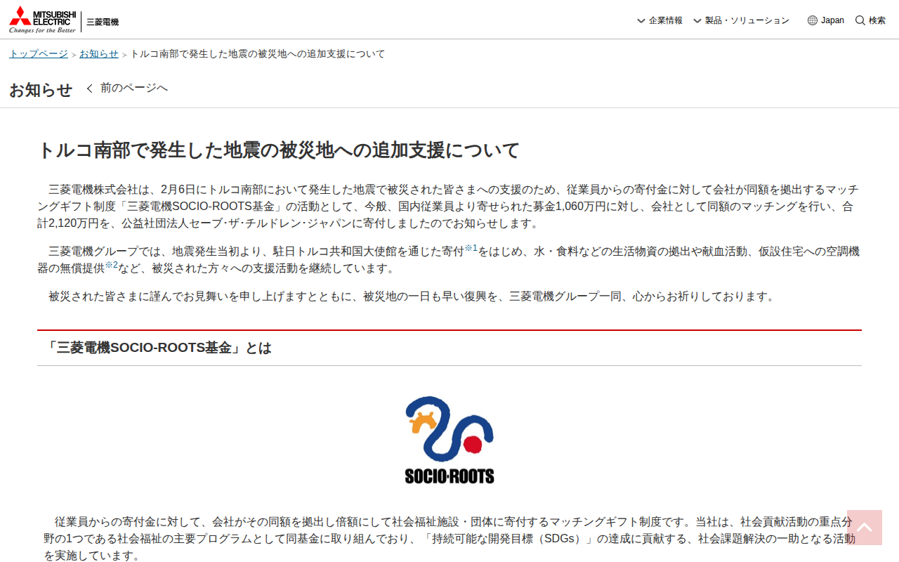 トルコ南部で発生した地震の被災地への追加支援について|三菱電機 お知らせ