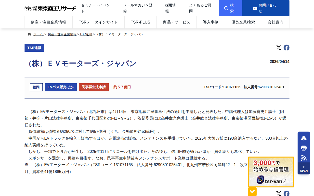(株)EVモーターズ・ジャパン | TSR速報 | 倒産・注目企業情報 | 東京商工リサーチ