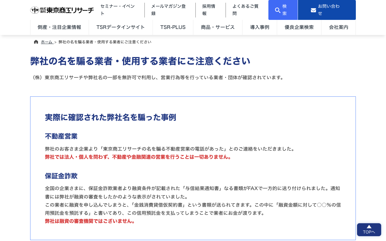 弊社の名を騙る業者・使用する業者にご注意ください | 東京商工リサーチ